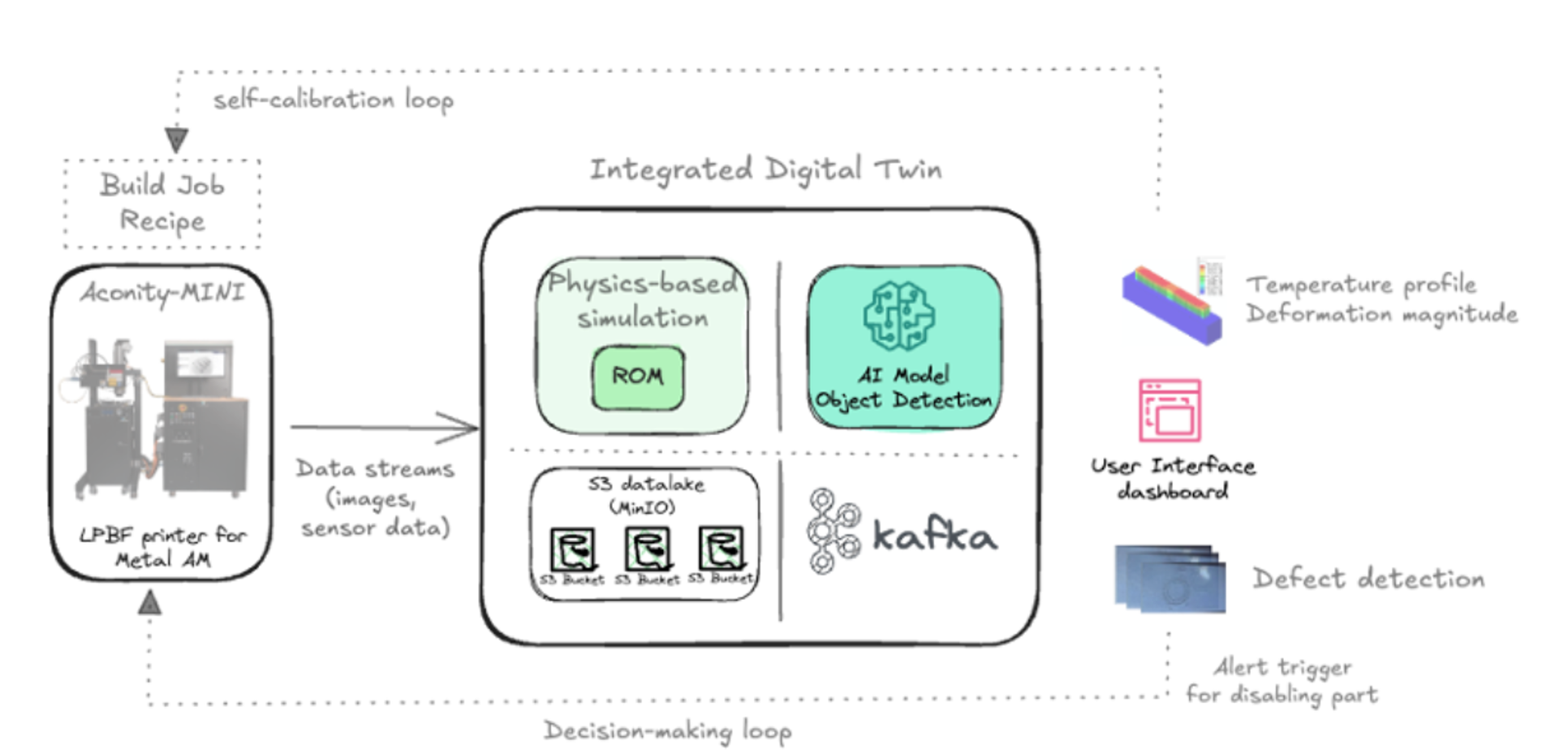 A cross-partner technical capability package delivering hybrid digital twin know-how—from testbed instrumentation and big-data pipelines to physics-based ROMs and AI defect detection—validated on metal 3D printers, using Laser-based Powder Bed Fusion (LPBF) process.